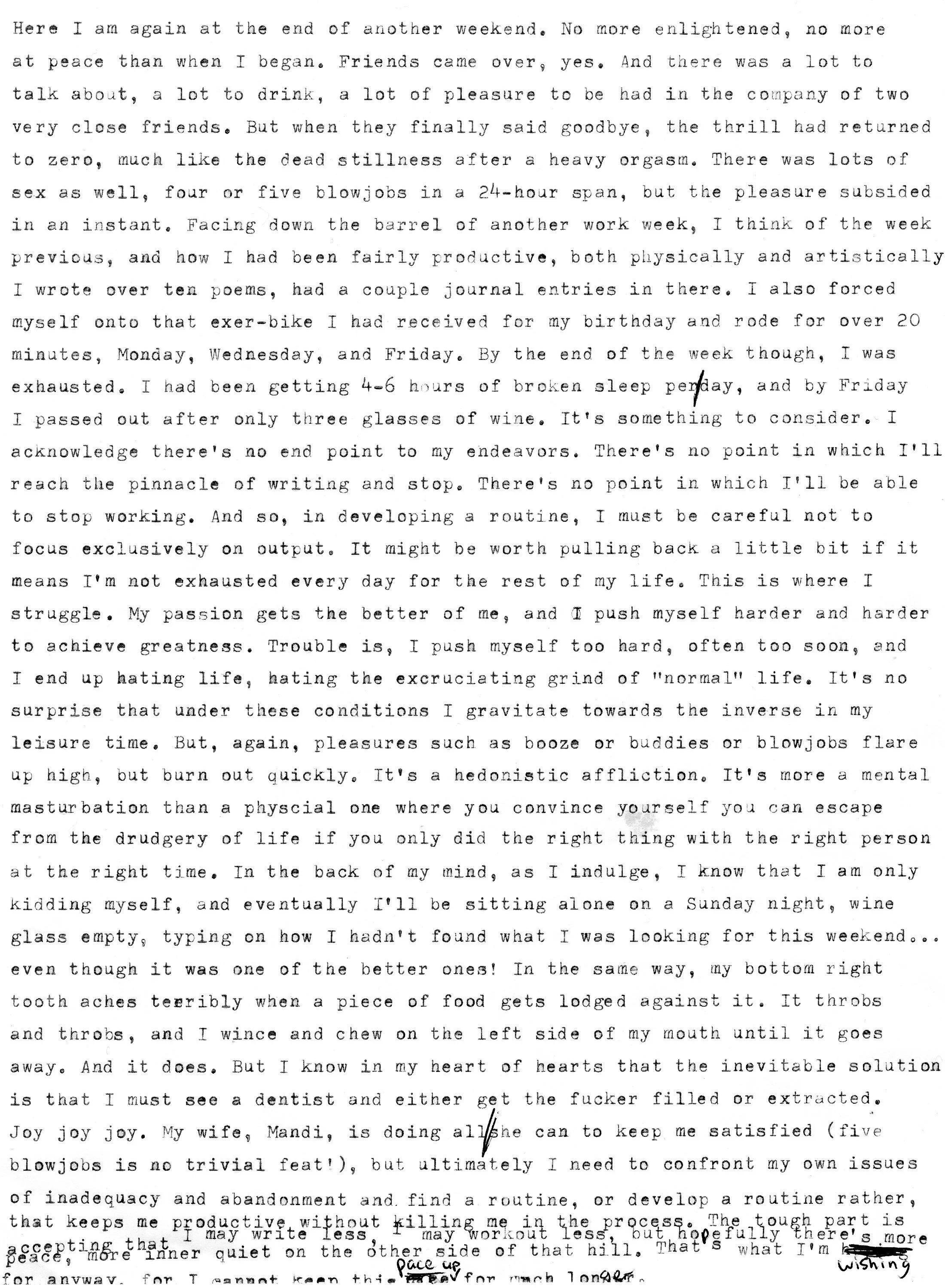 Facing down the barrel of another work week, I think of the week previous, and how I had been fairly productive, both physically and artistically. I wrote over ten poems, squeezed a couple journal entries in there. I also forced myself onto that exerbike I had received for my birthday and rode for over 20 minutes, Monday, Wednesday, and Friday. By the end of the week, though, I was exhausted. I had been getting 4 to 6 hours of broken sleep per night, and, by Friday, I had three glasses of wine and passed out.